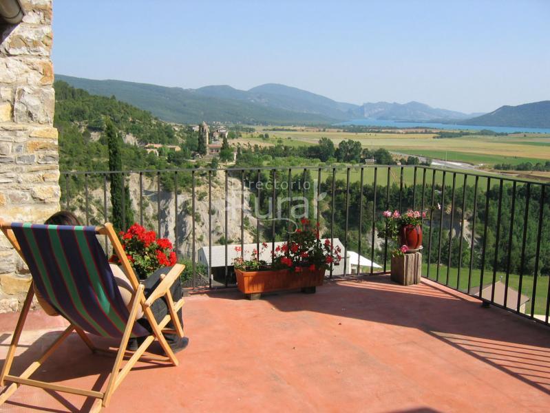 Llama la atención la entrada con su techo de forma redonda de piedra y los numerosos útiles agrícolas que adornan las paredes. La primera planta ofrece un amplio salón comedor con su hermoso suelo de barro cocido y balcón, una pequeña cocina bien equipada, y una autentica cocina antigua aragonesa con chimenea, bancos sólidos de madera y mesa de cocina plegable para los huéspedes que disfrutan del sabor de antaño. Cuenta también con 2 hermosas habitaciones dobles. La segunda planta ofrece a sus huéspedes un largo pasillo con suelo decorativo de cerámica que da acceso a las otras cuatro habitaciones dobles, un baño independiente, un lavadero y una terraza de donde conviene no perder un amanecer o un atardecer mirando al Embalse Mediano y a la iglesia del pueblo vecino.