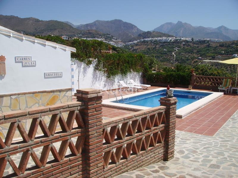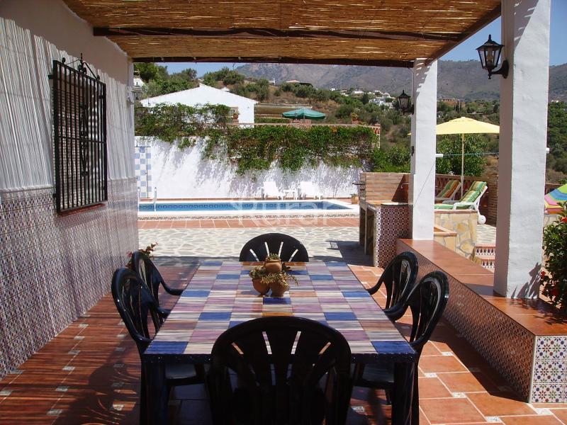 Capacidad para 4 personas. Amplias terrazas y porche con mesa de azulejos y barbacoa. Bonitas vistas al pueblo y a las montañas. La casa está a tan sólo 6 minutos de Frigiliana.
