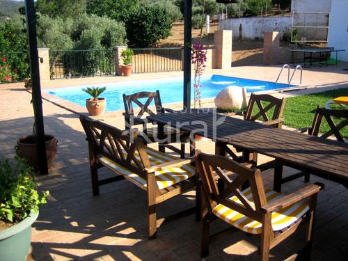 Cuenta con dos habitaciones (una con cama de matrimonio, y otra con dos camas individuales) y un sofa cama en el salón para los supletorios. La cocina toda equipada esta separada del salóm por una bara americana. Tiene su piscina privada con merendero y barbacoa.
