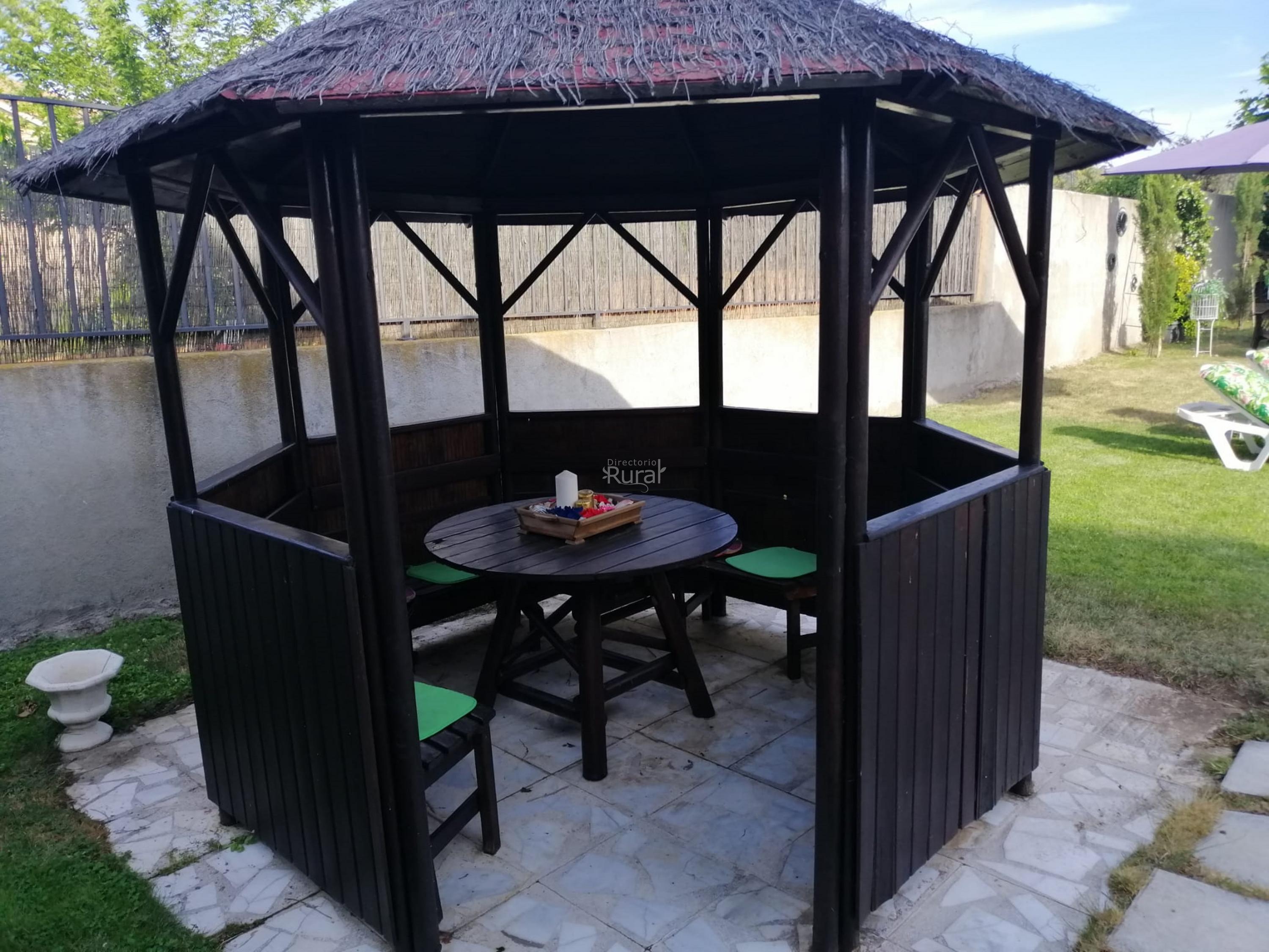 Pérgola o cenador de madera junto a la piscina con mesa y sillas.